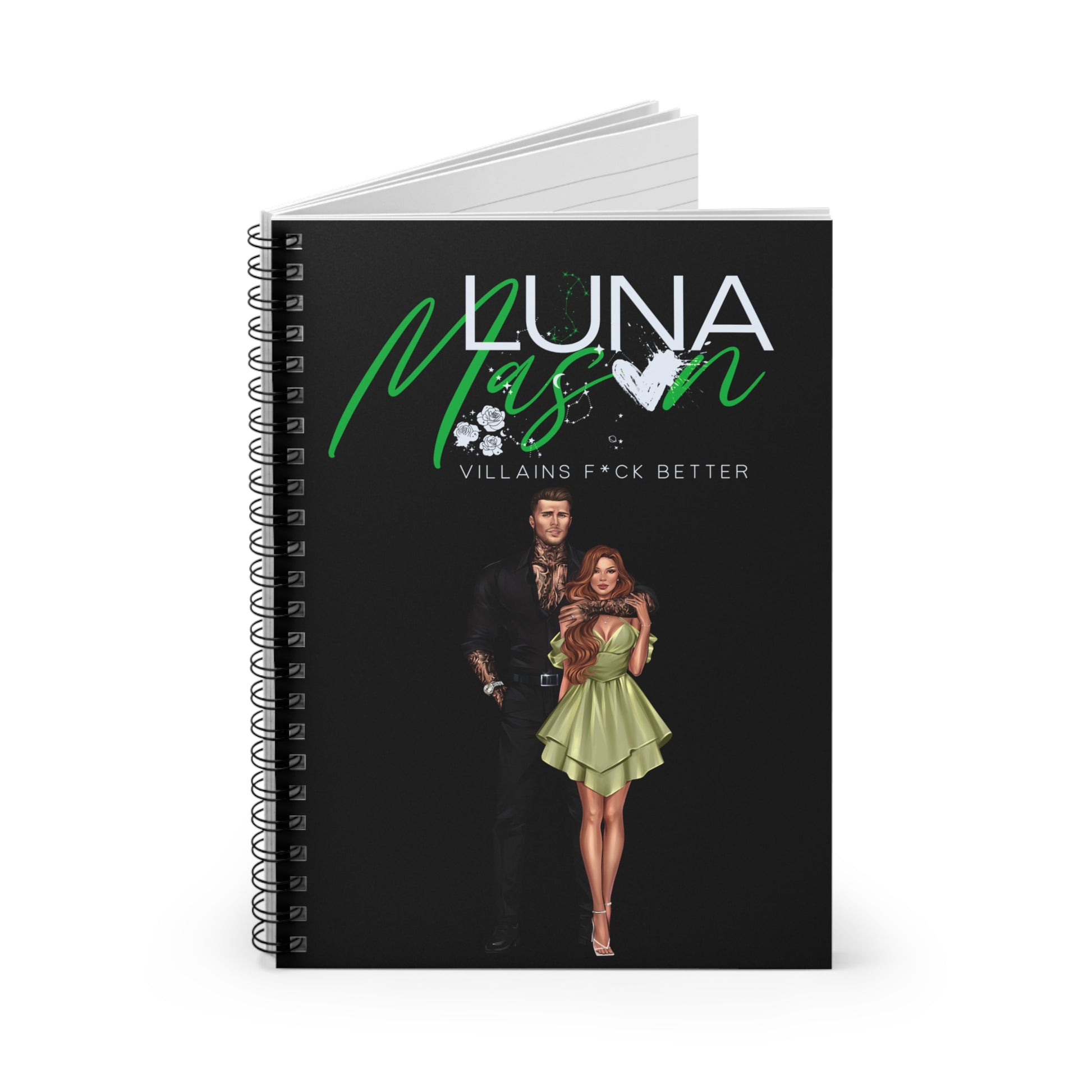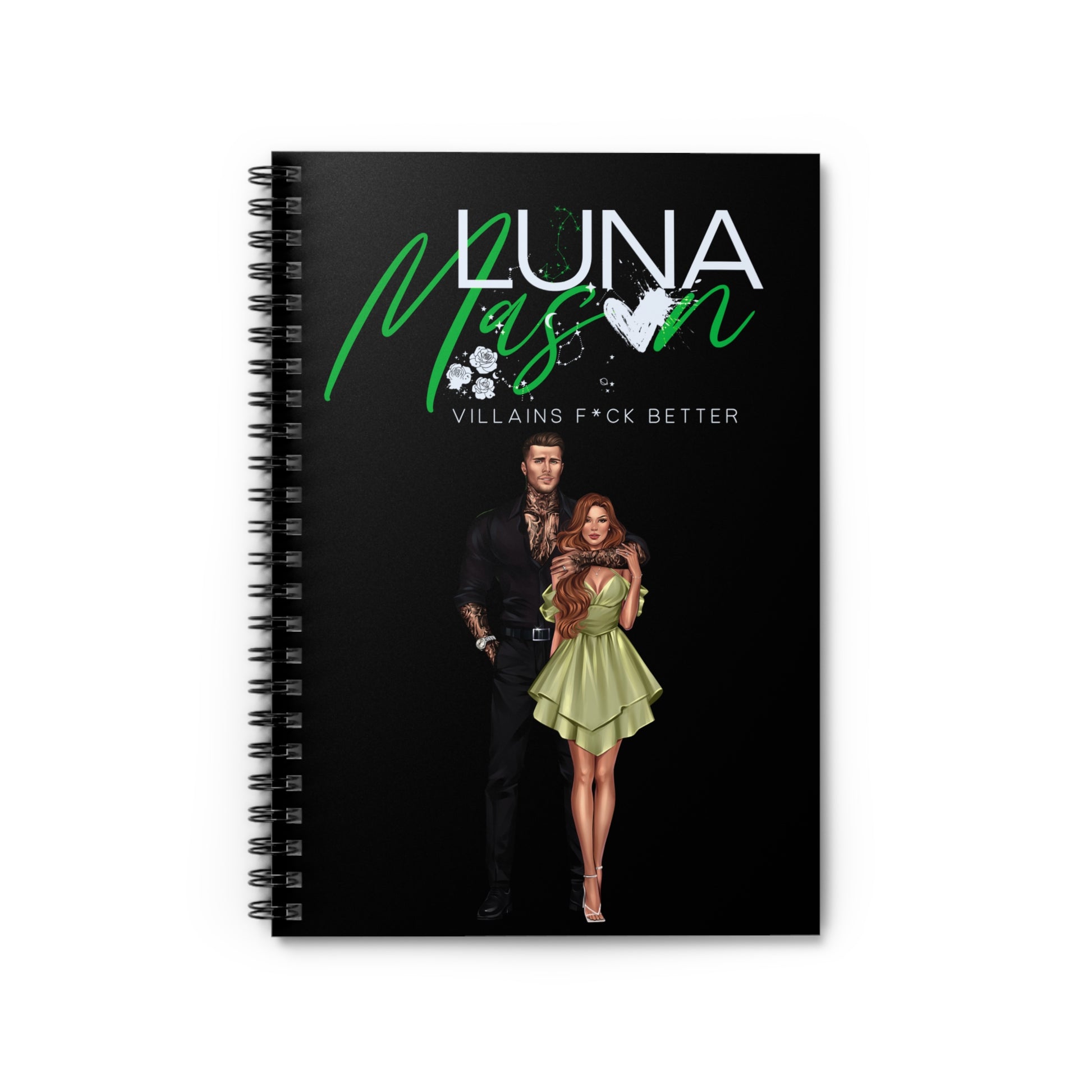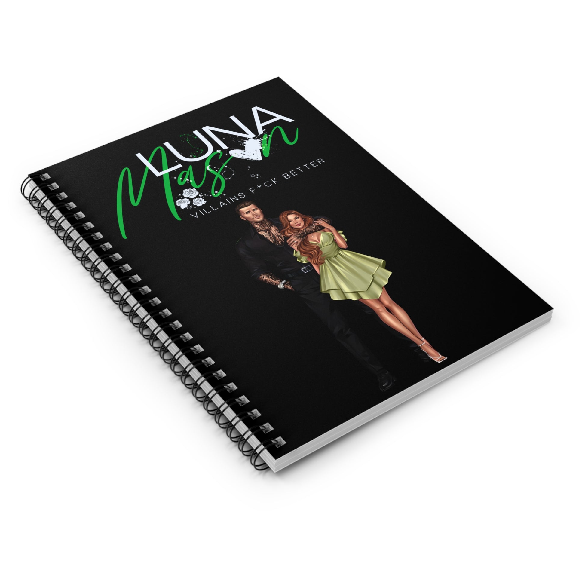 A compact spiral notebook built for story ideas, scene plans, and bold daydreams. The matte black cover features a striking duo illustration with vivid purple script and a bitten-heart accent — moody, glamorous, and a little dangerous. Inside, 118 ruled pages of smooth 90gsm paper invite longhand plotting, character notes, and quick sketches. The metal spiral lies flat for easy writing, and a document pocket on the inside back cover keeps loose notes, scribbled outlines, or reference photos tucked in. Carry it to writing sessions, fandom meetups, or late-night plotting marathons; it’s made to sit in your lap while you map out complicated characters and deliciously flawed romances.