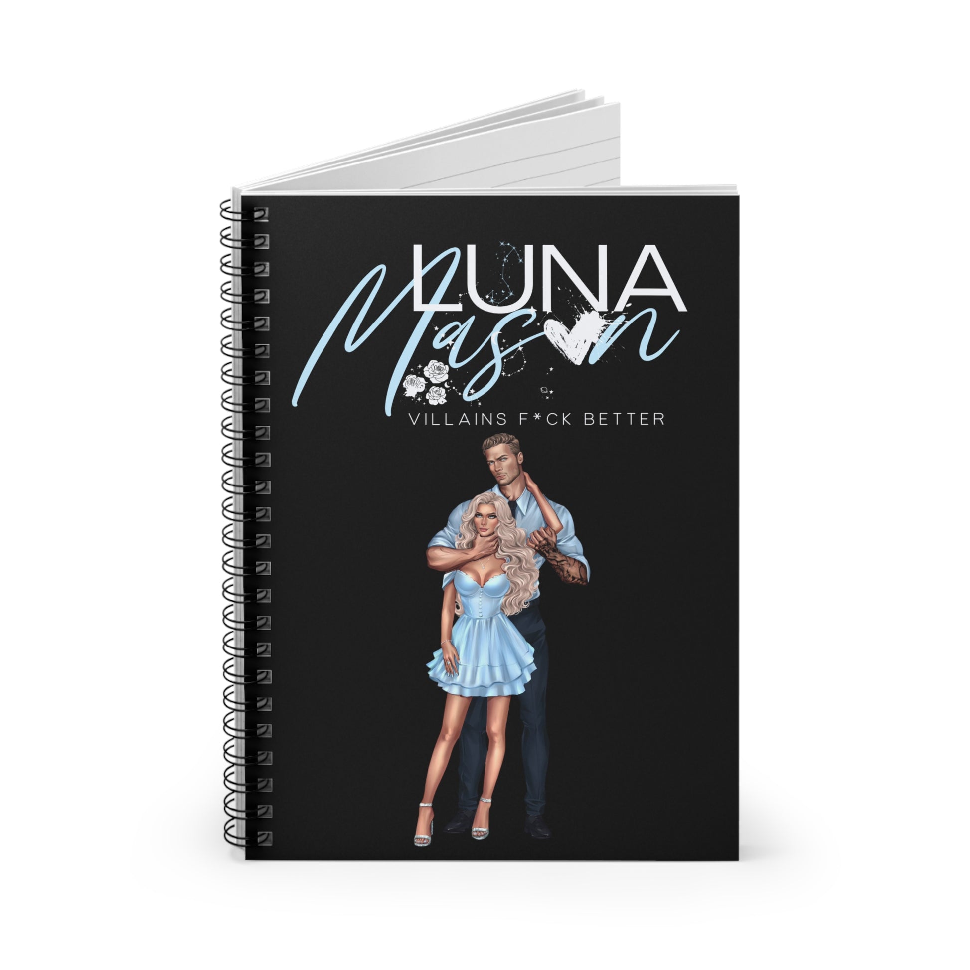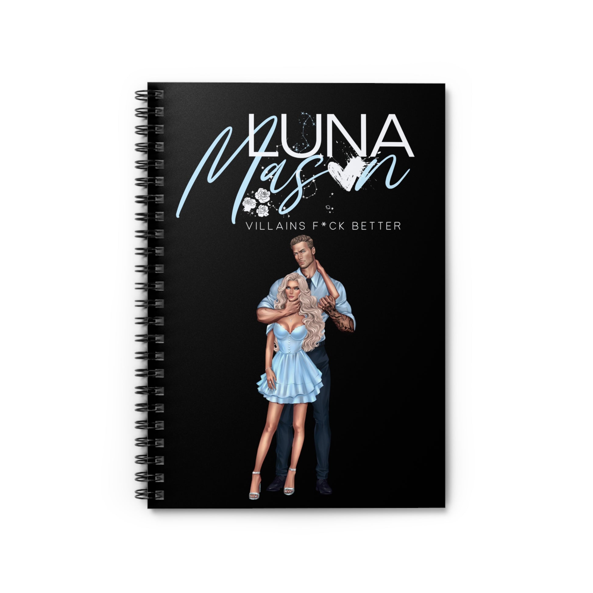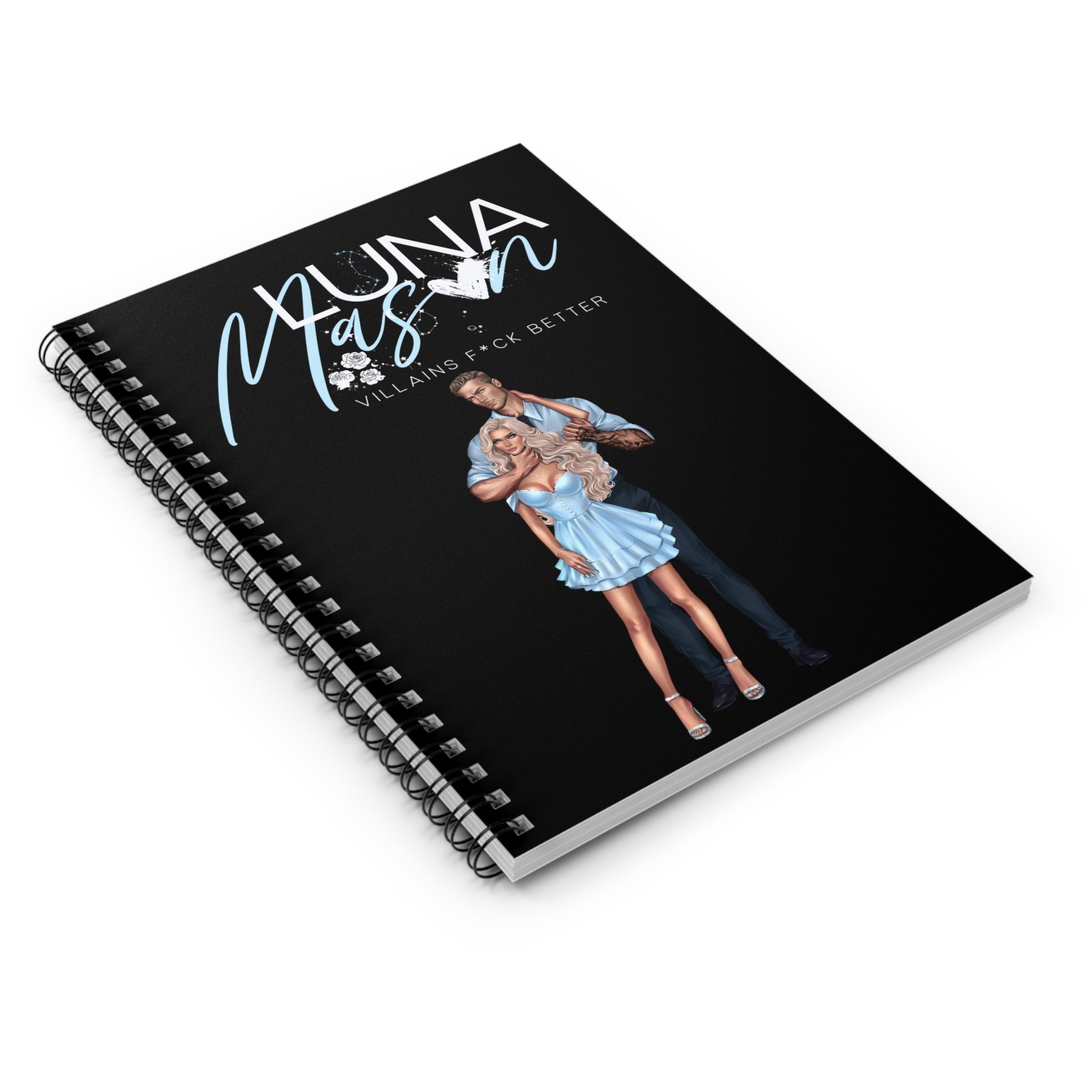 A compact spiral notebook built for story ideas, scene plans, and bold daydreams. The matte black cover features a striking duo illustration with vivid purple script and a bitten-heart accent — moody, glamorous, and a little dangerous. Inside, 118 ruled pages of smooth 90gsm paper invite longhand plotting, character notes, and quick sketches. The metal spiral lies flat for easy writing, and a document pocket on the inside back cover keeps loose notes, scribbled outlines, or reference photos tucked in. Carry it to writing sessions, fandom meetups, or late-night plotting marathons; it’s made to sit in your lap while you map out complicated characters and deliciously flawed romances.