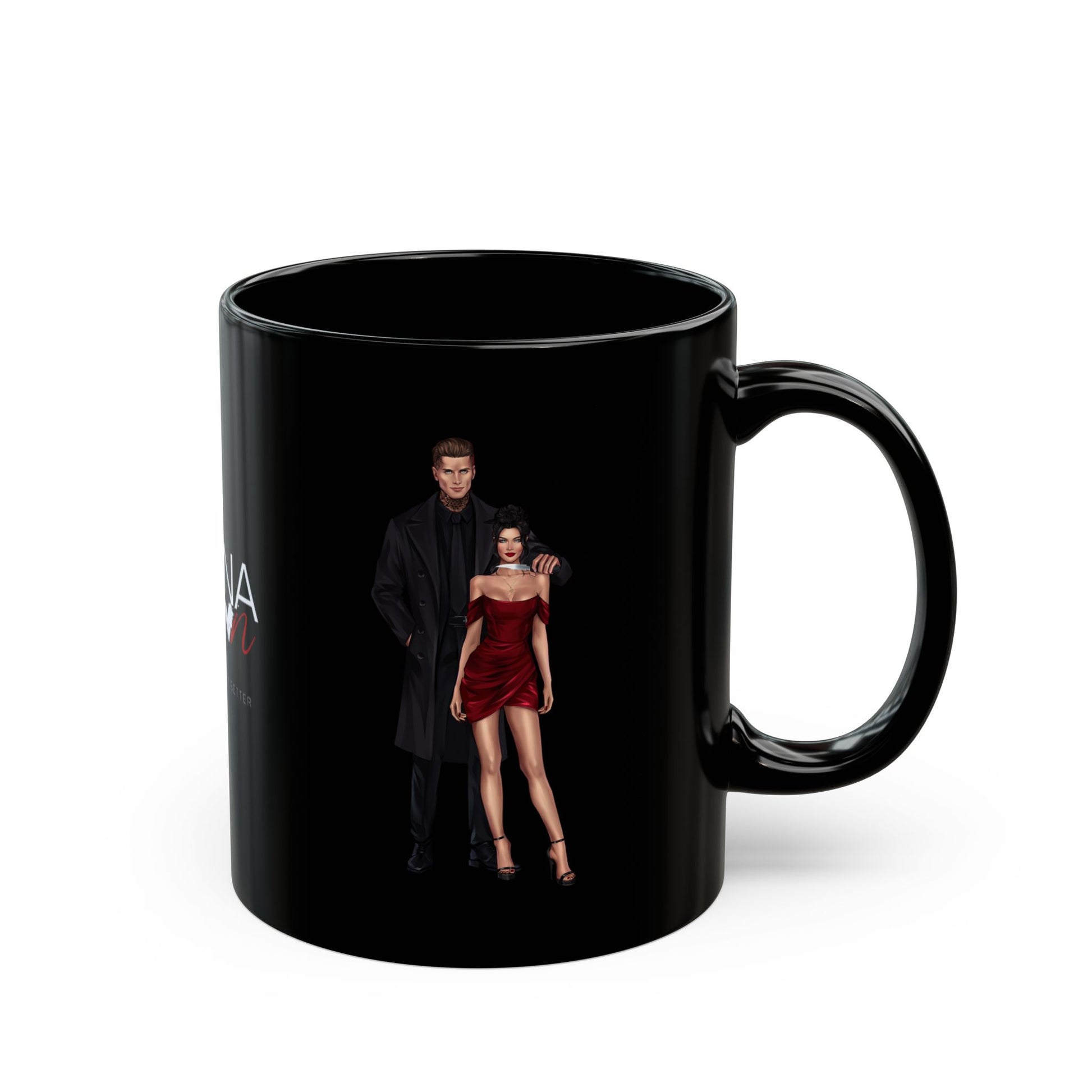 This glossy black ceramic mug carries bold, drama-filled artwork that reads like a scene from a glamorous night out. The deep black background makes the bright logo and stylized script pop, while the photo of three dressed-up figures adds a cinematic, slightly cheeky vibe. Hold it in the morning and you’ll feel the energy of nightlife and confident flair — a warm reminder of late-night laughter, rehearsed poses, and glittering afterparties. The comfortable C-handle and weight of the ceramic make each sip feel intentional. Use it when you want your coffee to match the mood: confident, playful, and a little daring.